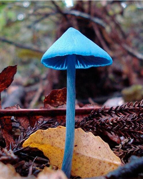 它是谁?它是粉褶菌属的霍氏粉褶菌。这种蘑菇的菌盖最大约5cm,但菌柄很细,只有约5mm直径,名副其实又蓝又瘦。