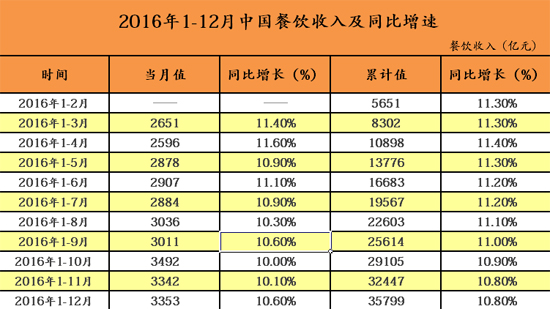 国家统计局公布的消费数据显示,2016年餐饮收入达到35799亿元,同比增长10.8%,保持了两位数增长。