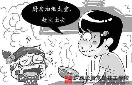 厨房的油烟与炒菜时的油温有直接关系,当油加热超过200℃时,所生成的油烟具有强烈的辛辣味,对鼻、眼、咽喉黏膜有较强的刺激,可能引起鼻炎、咽喉炎、气管炎等呼吸道疾病。当油温超过300℃,产生的有害物质会导致慢性中 毒,容易诱发呼吸和消化系统癌症。炒菜时,不要使油温过热,油温不要超过200℃(以油锅冒烟为极限),这样不仅能减少油烟的产生,菜中的维生素也能保留更多。