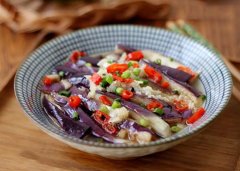 制作材料: 茄子1个,大蒜6瓣,红辣椒 半根,小葱1根,生抽10ML,醋30ML,凉开水30ML ,鸡精1克,盐适量,油 适量。 制作方法: 1、茄子洗净切大块,隔水蒸8分钟左右。 2、蒸熟的茄子放凉,用手撕成茄子条。 3、葱切