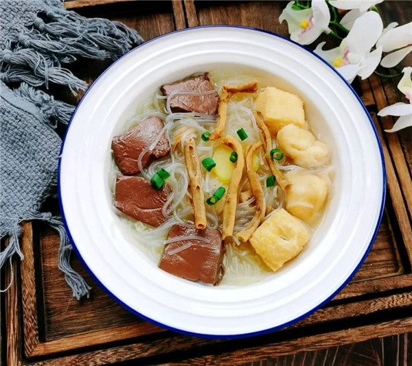 食材:鸭肠100克 / 鸭血1盒/粉丝1把 / 小葱1根/姜6片 / 豆腐泡150克/鸡汁适量 / 盐适量。