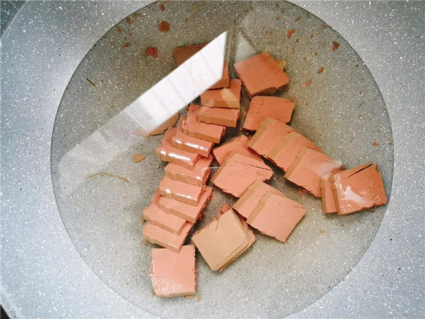 4、锅里倒入清水,冷水放入鸭血,放入2片姜,水开后煮30秒捞出,冷水放入鸭血可以有效去除腥味。