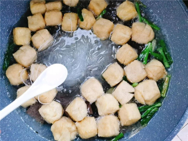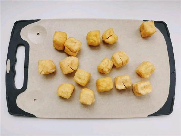 5、豆腐泡从中间切一刀,这样容易吸收汤汁,更加入味。