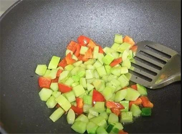 黄瓜纵剖几条,去掉黄瓜芯切小块