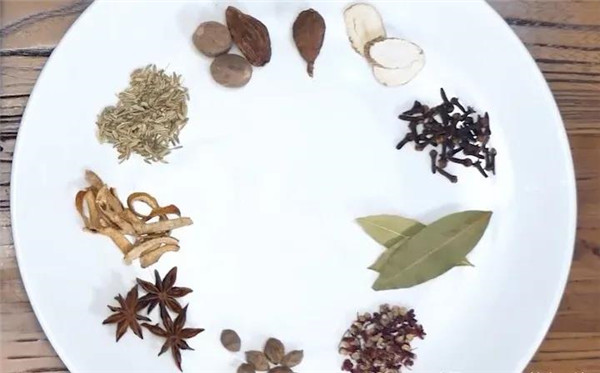 香料包组成:两颗八角、一片香叶、一颗草果、一颗肉蔻、一片白芷、少量的陈皮、小茴香、丁香、花椒