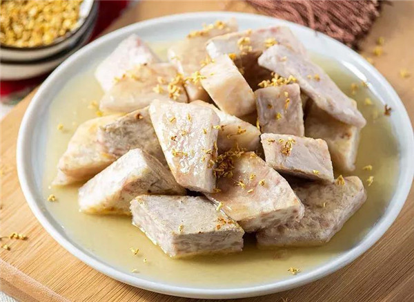 8.把熬好的糖汁均匀地浇在煎好的芋头上,淋上一勺蜂蜜,最后再撒上干桂花即可。