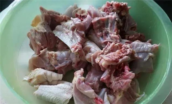 2、将鸡肉剁成大小适宜的肉块,多次清洗干净备用。