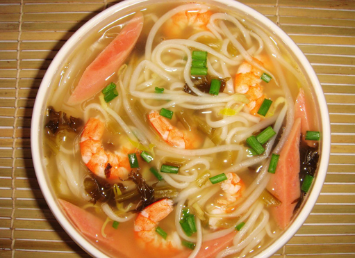 面条滑润,虾鲜嫩,菜爽口,汤鲜美。