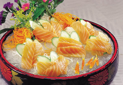 (3)切片:沿纹路切成尽可能的薄片,用盘装冰,将鱼片放城上边。放入冰箱,待吃时取出。