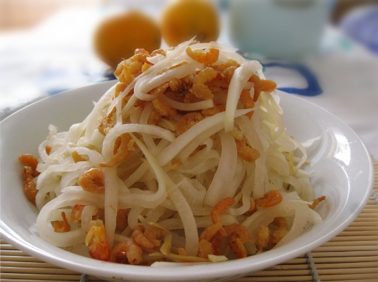 (2)锅中下油,加入葱姜茉,炒香,加下虾皮,翻几下加入萝卜丝翻炒。放些酱油调味,见萝卜丝开始出水加入粉丝,萝卜丝在下,粉丝在上,加入极少量水改小火盖好盖子约2-3分钟。