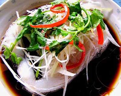 4、鱼蒸好后取出,把烧热的油浇到鱼上,再淋上剩余的蒸鱼豉油(10ml),放上红、绿菜椒丝做装饰即可。