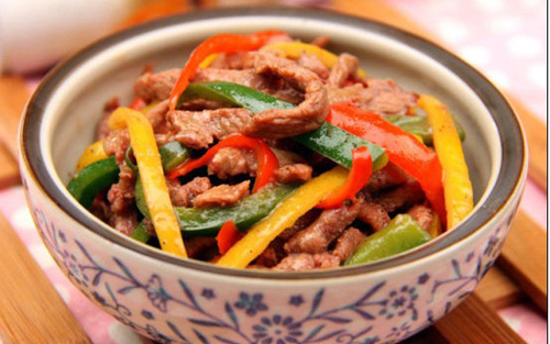 (3)锅放油,热锅凉油,油热后,放葱花姜茉炒香,入牛肉丝滑散,放少许高汤(极少)加盐、糖(提鲜用,以出鲜而不甜为好),放入椒丝,翻炒出锅。