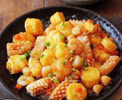 配料:虾仁、鲜扇贝、鱿鱼、鸡蛋、胡萝卜、红皮洋葱。