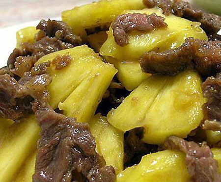 这个菜炒的时间不超过一分半钟,动作一定要快,事先最好一次性将牛肉味道腌足,不然牛肉炒久变老而韧,就不好吃了,菠萝不要煮太久,以免发酸。