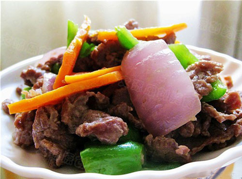 主料250g 牛肉 50g 洋葱 30g 胡萝卜 20g 青椒 配料适量 生姜 适量 油 适量 盐 适量 酱油 适量 料酒 适量 干淀粉