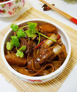 羊排炖好了之后,剩约1/3水,放入宽粉和萝卜,放入盐和少量白糖调味(羊排比较多,一顿吃不完,因此盛出了一部分)