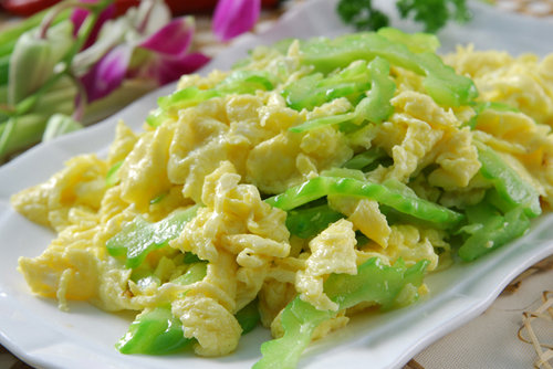 材料:苦瓜2条,鸡蛋4个,盐、油、味精各适量。