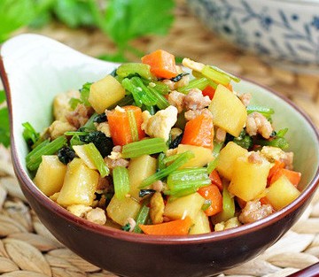 肉末、香芹、胡萝卜、土豆、鸡蛋、葱花。