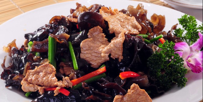 1、把木耳摘去硬根,洗净泥砂,把肉切木耳大小的薄片。