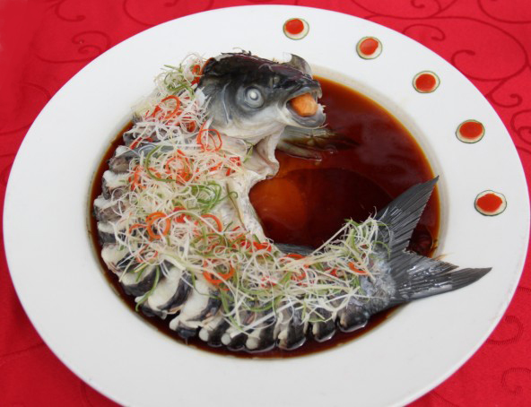 5、鱼蒸好后掉去一部分汤汁。汤汁可以做汤用。将葱丝、红椒丝放在鱼身上,浇上蒸鱼豉油。