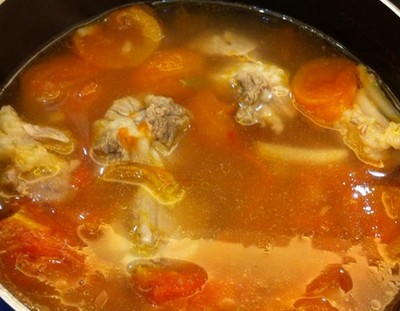 4、蕃茄切块,待排骨烂熟时,加入番茄,番茄酱。