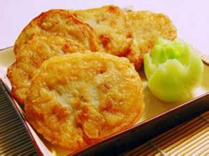 4、烧热油锅,油滚后开中火,放入藕片炸约2~3分钟,至双面呈现金黄色后,捞起沥干油分。