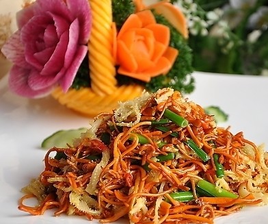 1、猪肚处理后,以胡椒汤煮熟,切丝备用;