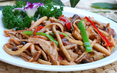 鲜猪肚200克,鲜茶树菇适量,蒜瓣、青红椒、米酒、食盐、白糖、生抽、香油、花生油各适量。