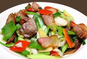 3、油热,倒入干红辣椒和花椒,出香味后,倒入腊肉片翻炒。