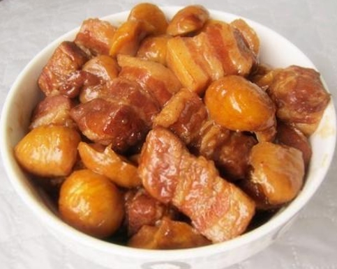 5、然后倒入少许红烧汁,加入调料后再放入剥好的板栗,快速翻炒;
