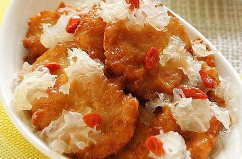 梨、银耳、枸杞、面粉、鸡蛋、白糖、水淀粉、油、盐