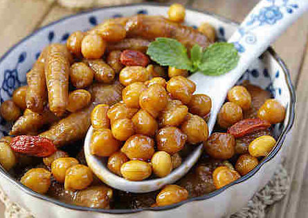 用料:鸡爪400克 黄豆50克 鹰嘴豆50克 枸杞子20粒 植物油适量 食盐2茶匙 酱油2汤匙 姜5片 水600毫升 冰糖8颗
