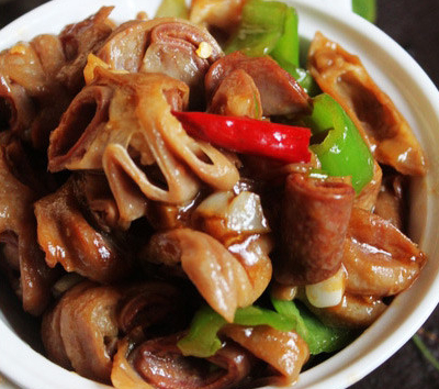 猪肠、尖椒、酱油、盐、葱、姜、蒜、花椒、淀粉