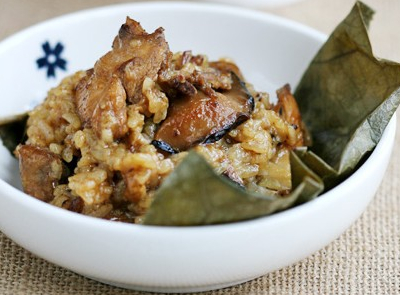 鲜荷叶3张、长粒糯米500g、鸡肉500g、香菇10朵、油3汤匙、葱姜几片、老抽1汤匙、生抽2汤匙、八角1个、水100ml、盐1茶匙。