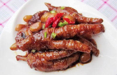 鸡爪、油、盐、姜、老抽、生抽、耗油、生粉、八角、桂皮、白醋、白糖