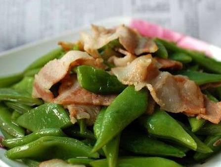3、煎培根的油不要倒掉,用来炒扁豆,如果不够可以加点色拉油.烧热油,放扁豆进去煸炒,然后放少许水煮两三分钟至扁豆熟透;