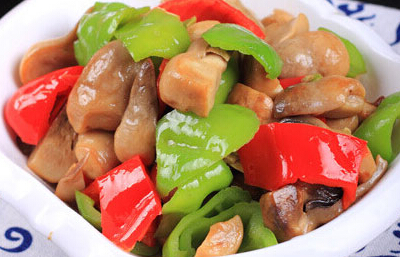 3、锅里放入橄榄油,烧热后把焯过水的草菇放进锅里翻炒,下入切好的青红辣椒块;