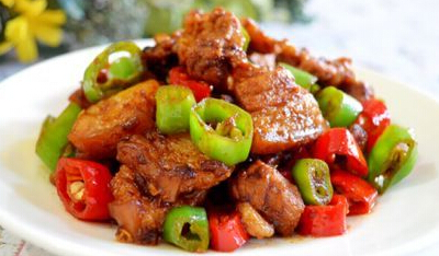 材料:五花肉、红椒、黄椒、绿椒(各半个)