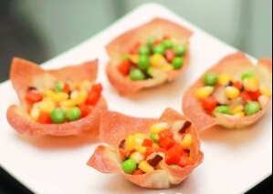 5、将炒好的蔬菜粒装到烤好的面皮盏,装饰即可。