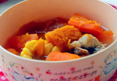材料:排骨、玉米、南瓜、胡萝卜、盐、料酒、姜