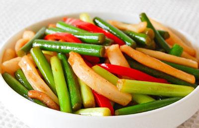 材料:蒜苔(250克)、小鱿鱼(1只)