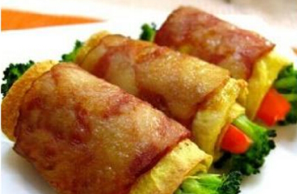 4、平底锅烧热,放少许油烧热,将培根卷放入锅内,小火煎至培根变色。