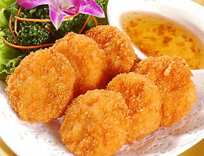 4、大火烧热炸锅中的油至七成热,放入虾饼半分钟后,将火力调至小火,当油锅中的虾饼炸至两面呈金黄色时再炸10 秒钟夹出,放在吸油纸上吸去多余的油分,吃时蘸上甜辣酱味道即可。