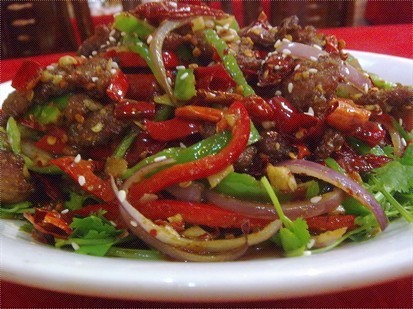 7.炒好的羊肉盛入铺了香菜的盘子里。
