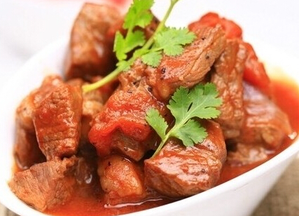 4、再把牛肉块放入煎炒一下,烹入红酒;