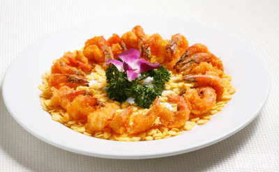 4、锅继续上火,捞出杂质,待油温六成热时,将事先炸好的凤尾虾再次放入锅中炸制,待外皮炸成金黄色时捞出装盘即可。
