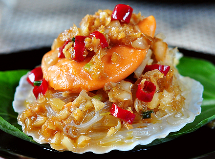4、每个扇贝上依次放:粉丝,蒜蓉,扇贝肉。