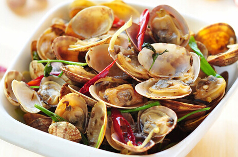 3、将锅烧热,调中火,花蛤洗净沥干水分放入锅中翻炒。