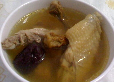 5、加入猪骨头,加入鸡块,大火烧开,然后撇去浮沫;