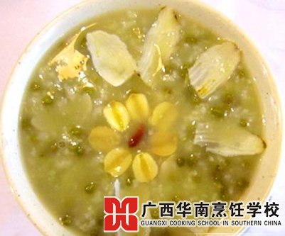 原料:绿豆80克、莲子50克、荷叶10克、冰糖20克、陈皮10克。